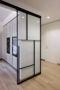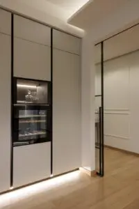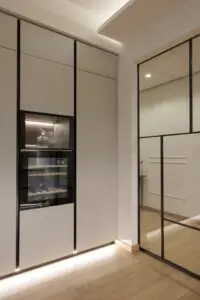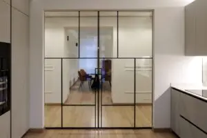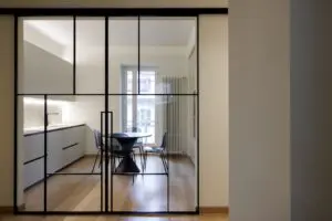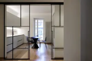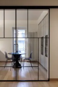 La cucina, separata dalla zona giorno da eleganti pareti vetrate, è uno spazio minimalista e pratico, caratterizzato da linee pulite e superfici chiare che amplificano la luce naturale. L’open space favorisce la convivialità e il comfort, mentre il pavimento in legno dona calore e continuità visiva in tutta la casa.